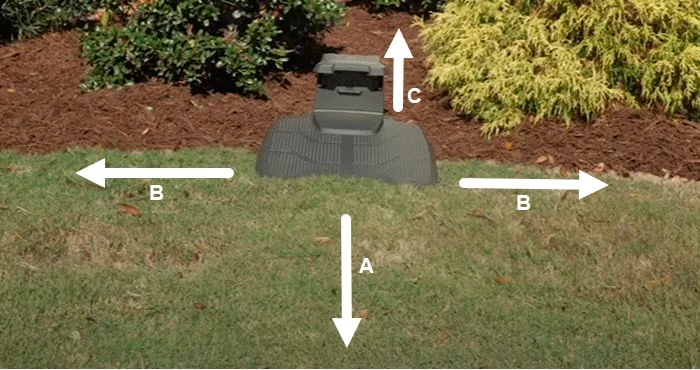 - Work area positioning: Place the charging station inside the work area (A) or outside (B). If placed outside (B), create a transport path (C) to the charging station during virtual boundary setup.