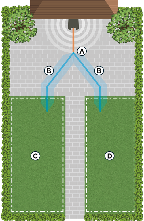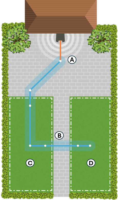 - Chemins de transport distincts : créez des chemins individuels (B) entre des zones de travail (C et D) et le point d'amarrage de la station de charge (A). Dans cette configuration, le robot tondeuse retourne à la station après avoir terminé chaque zone au lieu de se déplacer directement entre les zones de travail.