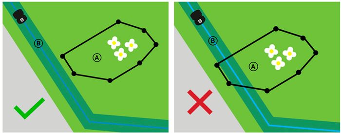 - Vältige transpordiradadele väljajäävate piirkondade paigutamist: transpordirajal liikudes ignoreerib niiduk tööalasid, kuid ei sisene väljajäävatesse piirkondadesse. Veenduge, et transpordirajal (B) liikudes ei blokeeriks niiduki teed ükski väljajääv piirkond (A)!