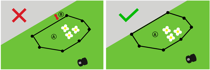 - Vältige blokeeritud alasid: veenduge, et väljajäävad piirkonnad (A) ei blokeeriks tööala (B) osi, mis muutuvad niidukile kättesaamatuks.