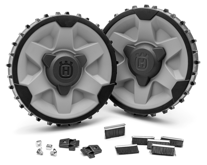 - Puhdista pyörät: Leikkurin on vaikeampi liikkua rinteissä, jos ruoho on tukkinut pyörät. Puhdista pyörät pehmeällä harjalla tai vesiletkulla. Automower®-leikkurin puhdistus- ja huoltopakkaus sisältää kaikki tarvikkeet, joita tarvitaan leikkurin peruspuhdistukseen ja kunnossapitoon leikkuukauden aikana.