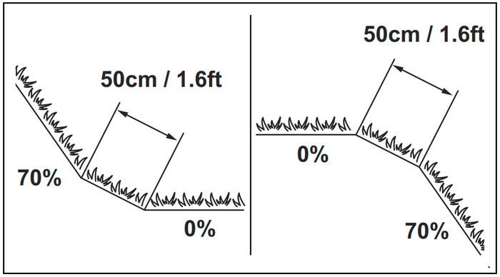 - Siirtymäalue: Jätä tasaisten alueiden ja jyrkkien rinteiden väliin vähintään 50 cm:n tasainen alue.