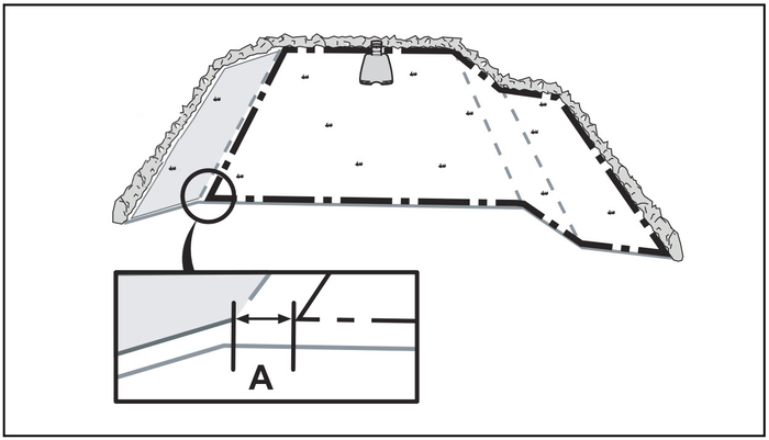 - Ulkoreunan säätäminen: Jos työalueen ulkoreuna on leikkurin raja-arvoa jyrkempi, sijoita raja tasaiselle maalle kauemmas rinteestä (A).