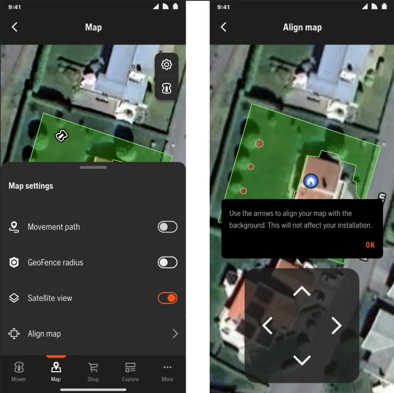 Funkcja Wyrównaj mapę w aplikacji umożliwia wizualne wyrównanie mapy Google z instalacją AIM lub EPOS robota Automower®. W aplikacji Automower® Connect przejdź do Mapa > Widok satelity. Użyj strzałek, aby wyrównać mapę z tłem. Nie będzie to miało wpływu na instalację. Ta funkcja jest obecnie dostępna tylko w systemie Android.