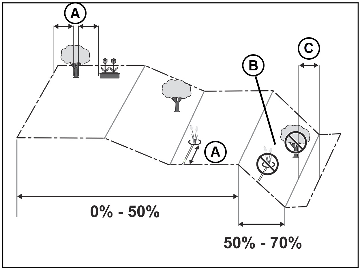 - Усередині робочої зони роботизована газонокосарка може обробляти схили, що не перевищують максимального гарантованого рівня для відповідної моделі. Більш круті ділянки мають бути ізольовані граничним дротом.