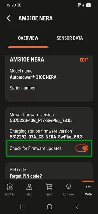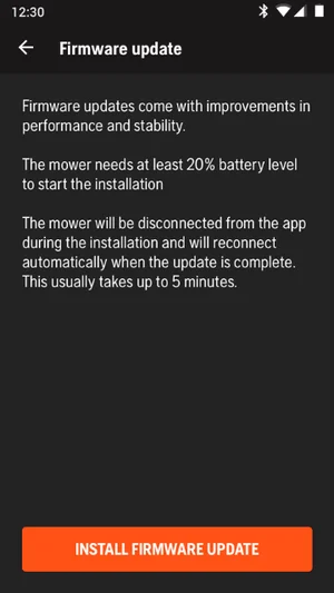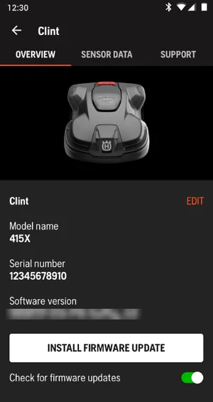 - У застосунку Automower® Connect має бути ввімкнено параметр Check for new firmware updates (Перевіряти наявність оновлень вбудованого програмного забезпечення) (розташовано в розділі under More (Більше) > My mowers (Мої косарки) > Mower details (Дані косарки)). У заводських налаштуваннях цю функцію ввімкнено.