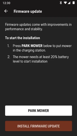 3. Для запуску встановлення треба достатньо зарядити косарку. Натисніть Park mower (Припаркувати косарку), щоб поставити косарку на зарядну станцію.