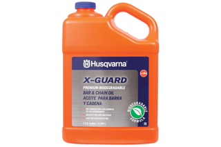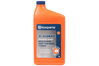 Husqvarna's X-Guard premium bar and chain oil (made of virgin oil, not reclaimed oils) optimizes your chainsaw's cutting performance by reducing heat and friction. X-Guard offers a premium blend of base stocks and tackifier additives that reduces oil throw-off at high speeds.