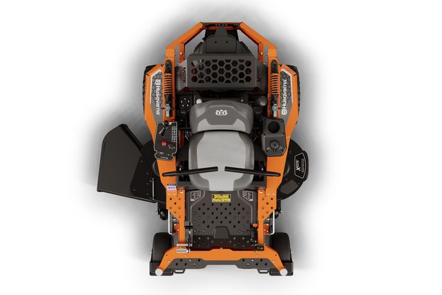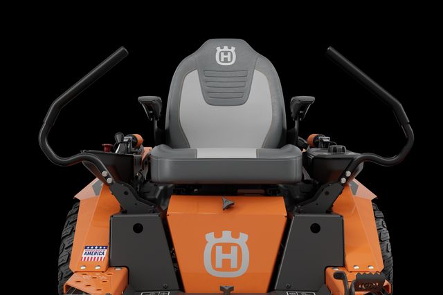 Front view of a Husqvarna zero-turn mower with visible seat and steering controls.